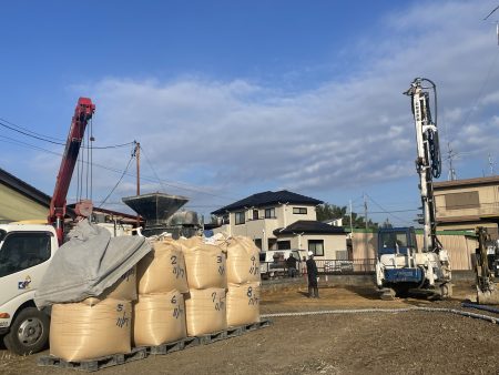前もって行っていた地盤調査の結果を踏まえて、今回は柱状地盤改良工事を採用。