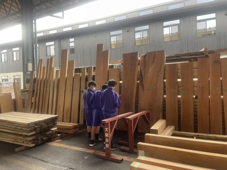 ・木材市場に行き、いろんな木の種類を確認しながら見て回り、機械でプレカットの加工をする様子も見学させてもらいました。